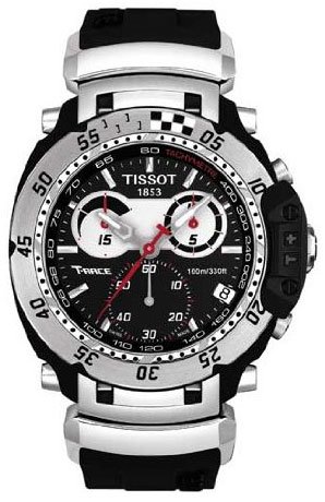 Carbon composite and stainless steel case with a black rubber strap. Bidirectional satinless steel bezel. Black dial with luminous hands and stick hour markers. Minute markers. tachymeter around the outer rim. Luminiscent hands and markers. Date displays at the 4 o'clock position. Chronograph - three sub-dials displaying: 1/10th second, 30 minutes and 60 seconds. Quartz movement. Scratch resistant sapphire crystal. Protected crown. Solid case back. Case diameter: 43.5 mm. Case thickness: 12.9 mm. Fold over clasp with double safety releae. Water resistant at 100 meters / 330 feet. Functions: hours, minutes, seconds, date, chronograph, tachymeter. Tissot T-Race MotoGP 2009 Limited Edition Mens Watch T027.417.17.051.00.
